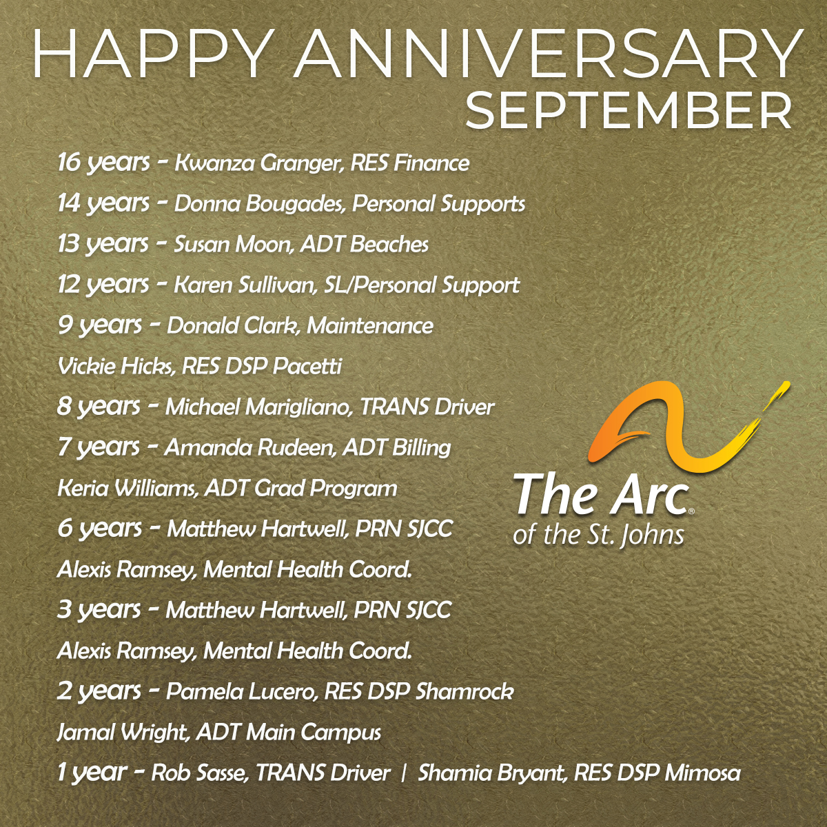 We want to say a special thank you and congratulations to ALL our amazing teammates celebrating anniversaries with The Arc of the St. Johns in September. Our teammates provide a special role at The Arc and are the backbone of our organization. Thank you for...